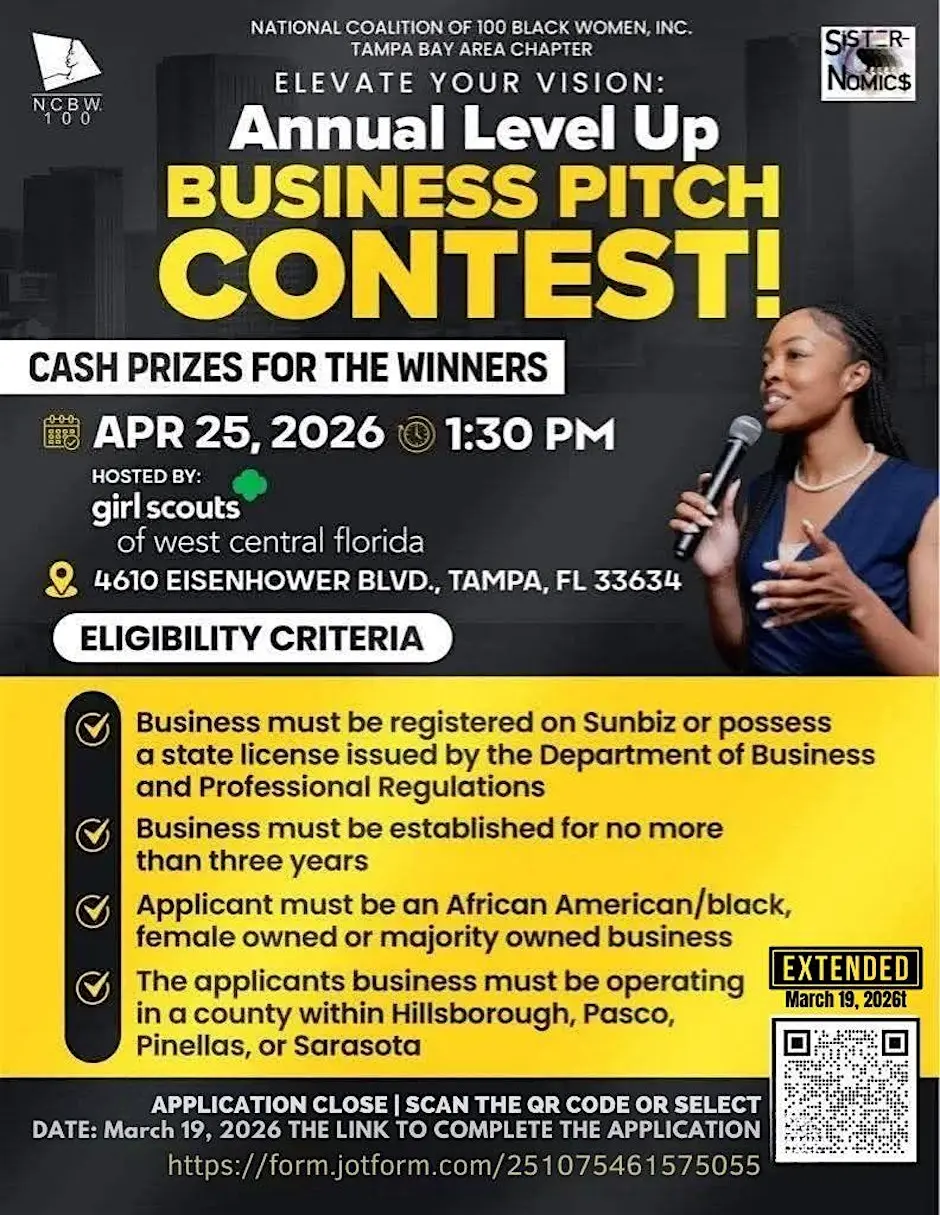 Pitch Competition – Tampa Bay An exciting opportunity for entrepreneurs and innovators is coming to Tampa Bay! The Pitch Competition, organized by National Coalition of 100 Black Women Tampa Bay Area Chapter, invites participants to showcase their business ideas and compete for recognition while connecting with the local business community. The competition will take place at 4610 Eisenhower Blvd, running from Saturday, March 7 at 9:40 PM through Thursday, March 19 at 11:59 PM. This event provides a great platform for aspiring entrepreneurs to present their concepts, gain exposure, and network with fellow innovators. Those interested in participating or learning more about the event can register online through Eventbrite. You can also follow the organizers on social media for updates and event highlights. Event Registration: https://www.eventbrite.com/e/pitch-competition-tickets-1984689823689?aff=ebdssbdestsearch#location Social Media: Instagram – https://www.instagram.com/p/DT_epzfDGBU/ Facebook – https://www.facebook.com/ncbw.tampabay/photos/d41d8cd9/1322146313279792/ #Tampa #TampaBay #StPete #Clearwater #ThingsToDo #LocalEvents #Networking #TampaBayConnects #TampaNetworking #WomenInBusiness #TampaEntrepreneurs #Startups #TampaEats #TampaNightlife #DowntownTampa #TampaEvents #TampaSocials #tampaMagazine #TampaBayMagazine TampaBusinessClub.com Tampabayconnects.com WomenImpactNetwork.com TampaBayLatinChamber.com InGateConsulting.com 🔗 Register here: https://www.eventbrite.com/e/pitch-competition-tickets-1984689823689?aff=ebdssbdestsearch#location Tampa Bay Connects is a community discovery and media platform. We do not organize, host, manage, or operate the events featured on this site. All events, trademarks, logos, photographs, and promotional materials are the property of their respective owners and are displayed for informational and promotional purposes only. Our content is shared to help connect the community with local experiences and is sourced from public event listings, organizers, or official promotional channels. Full credit is given to the original event organizers, and direct links to official event pages are provided whenever available. Inclusion on TampaBayConnects.com does not imply sponsorship, partnership, or endorsement by Tampa Bay Connects, unless explicitly stated. tampabayconnects