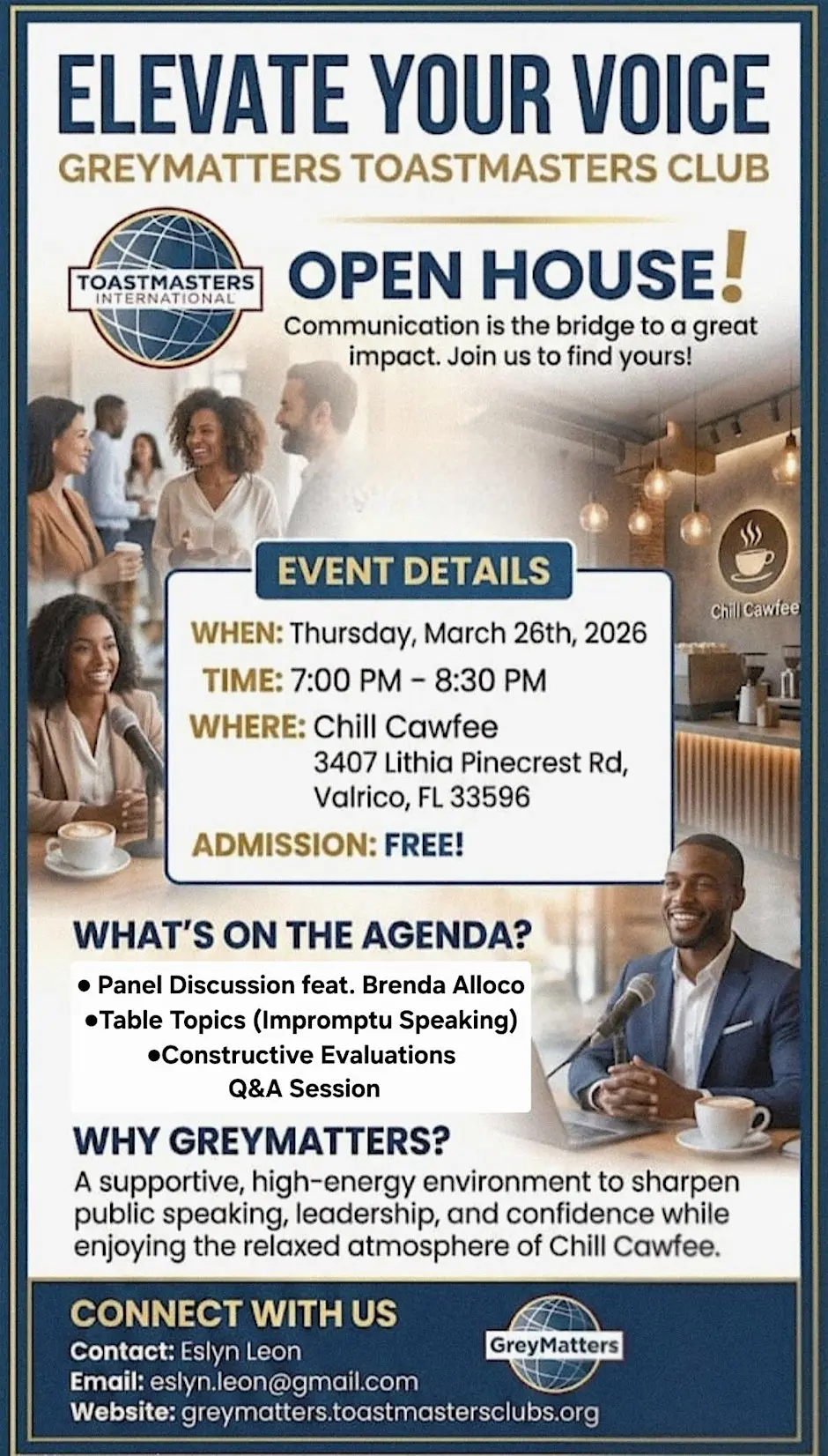Grey Matters Toastmasters Club Open House – Valrico Looking to improve your public speaking and leadership skills? Join the Grey Matters Toastmasters Club Open House, organized by Toastmasters International, for an evening of learning, networking, and personal growth. This event is perfect for anyone interested in gaining confidence and connecting with like-minded individuals. The open house will take place at Chill Cawfee on Thursday, March 26 from 7:00 PM to 8:30 PM. Reserve your spot online: https://www.eventbrite.com/e/grey-matters-toastmasters-club-open-house-tickets-1984351621116?aff=ebdssbdestsearch Connect with the organizers: Website – https://www.toastmasters.org/ Instagram – https://www.instagram.com/toastmastersofficial/ #Tampa #TampaBay #StPete #Clearwater #ThingsToDo #LocalEvents #Networking #TampaBayConnects #TampaNetworking #WomenInBusiness #TampaEntrepreneurs #Startups #TampaEats #TampaNightlife #DowntownTampa #TampaEvents #TampaSocials #tampaMagazine #TampaBayMagazine TampaBusinessClub.com Tampabayconnects.com WomenImpactNetwork.com TampaBayLatinChamber.com InGateConsulting.com 🔗 Register here: https://www.eventbrite.com/e/grey-matters-toastmasters-club-open-house-tickets-1984351621116?aff=ebdssbdestsearch Tampa Bay Connects is a community discovery and media platform. We do not organize, host, manage, or operate the events featured on this site. All events, trademarks, logos, photographs, and promotional materials are the property of their respective owners and are displayed for informational and promotional purposes only. Our content is shared to help connect the community with local experiences and is sourced from public event listings, organizers, or official promotional channels. Full credit is given to the original event organizers, and direct links to official event pages are provided whenever available. Inclusion on TampaBayConnects.com does not imply sponsorship, partnership, or endorsement by Tampa Bay Connects, unless explicitly stated. tampabayconnects