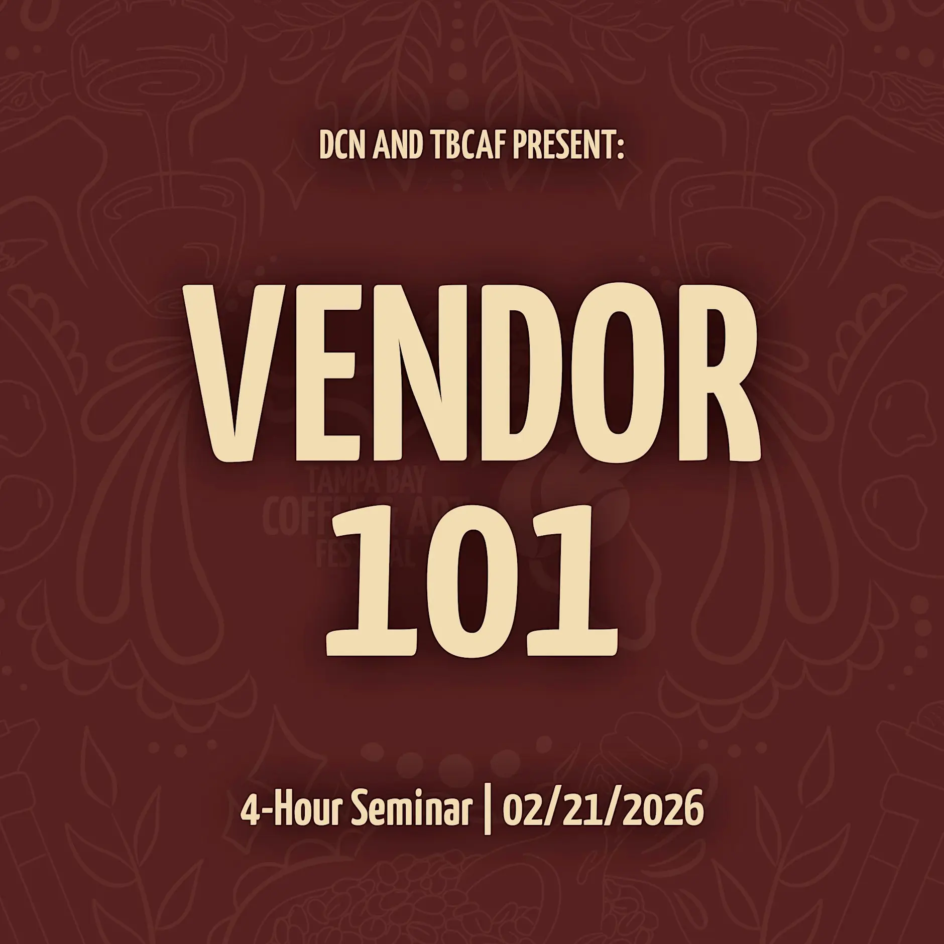 Vendor 101 Seminar – Brandon, FL Tampa Bay Connects is pleased to reshare a valuable educational opportunity designed for current and aspiring vendors looking to grow and strengthen their business operations. The Vendor 101 Seminar will take place on Saturday, June 6, from 9:00 AM to 1:00 PM at The Noise Box in Brandon, FL. This seminar provides practical guidance on vendor setup, business readiness, and strategies for successfully participating in markets, festivals, and community events. This event is organized by the Tampa Bay Coffee and Art Festival (TBCAFFL) team, a group dedicated to supporting local vendors, creatives, and entrepreneurs through events and educational programs. 📍 Event Details: Event: Vendor 101 Seminar Date: Saturday, June 6, 2026 Time: 9:00 AM – 1:00 PM Location: The Noise Box, Brandon, FL 🔗 Registration Link: https://www.eventbrite.com/e/vendor-101-seminar-tickets-1984587966030?aff=ebdssbdestsearch 🌐 Organizer Website: https://www.tampabaycoffeeandartfestival.com/vendor101.html 📱 Social Media: Instagram: https://www.instagram.com/tbcaffl/ LinkedIn: https://www.linkedin.com/company/tbcaffl/ As always, Tampa Bay Connects is a reshare platform. We do not host or organize this event. For more information, please visit the registration link or contact the event organizers directly. #Tampa #TampaBay #StPete #Clearwater #ThingsToDo #LocalEvents #Networking #TampaBayConnects #TampaNetworking #WomenInBusiness #TampaEntrepreneurs #Startups #TampaEats #TampaNightlife #DowntownTampa #TampaEvents #TampaSocials #tampaMagazine #TampaBayMagazine TampaBusinessClub.com Tampabayconnects.com WomenImpactNetwork.com TampaBayLatinChamber.com InGateConsulting.com 🔗 Register here: https://www.eventbrite.com/e/vendor-101-seminar-tickets-1984587966030?aff=ebdssbdestsearch Tampa Bay Connects is a community discovery and media platform. We do not organize, host, manage, or operate the events featured on this site. All events, trademarks, logos, photographs, and promotional materials are the property of their respective owners and are displayed for informational and promotional purposes only. Our content is shared to help connect the community with local experiences and is sourced from public event listings, organizers, or official promotional channels. Full credit is given to the original event organizers, and direct links to official event pages are provided whenever available. Inclusion on TampaBayConnects.com does not imply sponsorship, partnership, or endorsement by Tampa Bay Connects, unless explicitly stated. tampabayconnects
