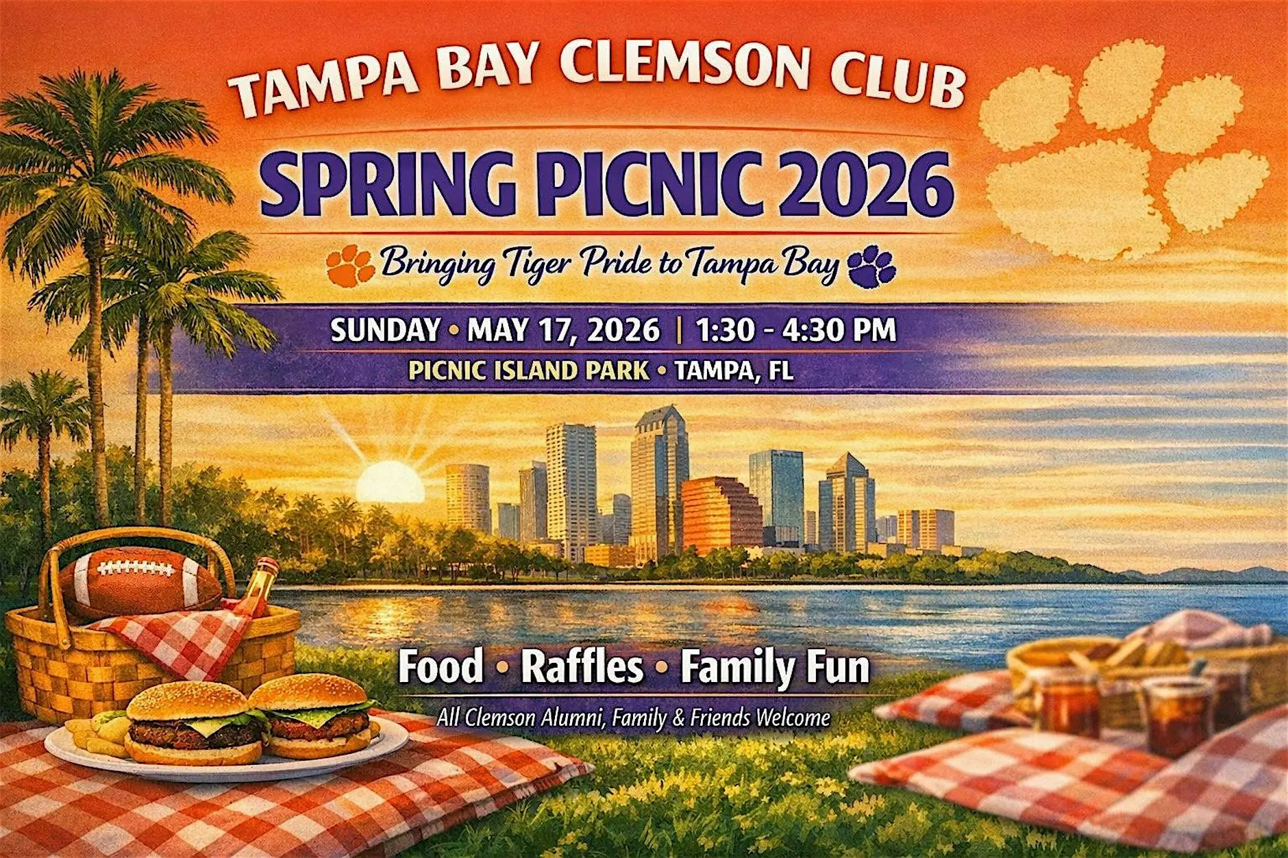 Tampa Bay Clemson Club Spring Picnic – Community Reshare Event Tampa Bay Connects is sharing information about an upcoming community gathering hosted by the Tampa Bay Clemson Club. This is a reshared event post only—we do not host or organize this activity. Join Clemson alumni, friends, and families for a relaxed Spring Picnic in Tampa Bay. 📅 Event Details Event: Spring Picnic Date: Sunday, May 17, 2026 Time: 1:30 PM – 4:30 PM Location: Picnic Island Park, Tampa, FL 🎟️ Registration Link: https://www.eventbrite.com/e/tampa-bay-clemson-club-spring-picnic-tickets-1986863282563?aff=ebdssbdestsearch 📣 Organizers: Tampa Bay Clemson Club 📲 Social Media: Instagram: https://www.instagram.com/tampabay_clemsonclub/ Facebook: https://www.facebook.com/TampaBayClemsonClub/ We encourage interested participants to visit the official links for full details, ticket availability, and updates. — Tampa Bay Connects Online Reshare Platform #Tampa #TampaBay #StPete #Clearwater #ThingsToDo #LocalEvents #Networking #TampaBayConnects #TampaNetworking #WomenInBusiness #TampaEntrepreneurs #Startups #TampaEats #TampaNightlife #DowntownTampa #TampaEvents #TampaSocials #tampaMagazine #TampaBayMagazine TampaBusinessClub.com Tampabayconnects.com WomenImpactNetwork.com TampaBayLatinChamber.com InGateConsulting.com 🔗 Register here: https://www.eventbrite.com/e/tampa-bay-clemson-club-spring-picnic-tickets-1986863282563?aff=ebdssbdestsearch Tampa Bay Connects is a community discovery and media platform. We do not organize, host, manage, or operate the events featured on this site. All events, trademarks, logos, photographs, and promotional materials are the property of their respective owners and are displayed for informational and promotional purposes only. Our content is shared to help connect the community with local experiences and is sourced from public event listings, organizers, or official promotional channels. Full credit is given to the original event organizers, and direct links to official event pages are provided whenever available. Inclusion on TampaBayConnects.com does not imply sponsorship, partnership, or endorsement by Tampa Bay Connects, unless explicitly stated. tampabayconnects