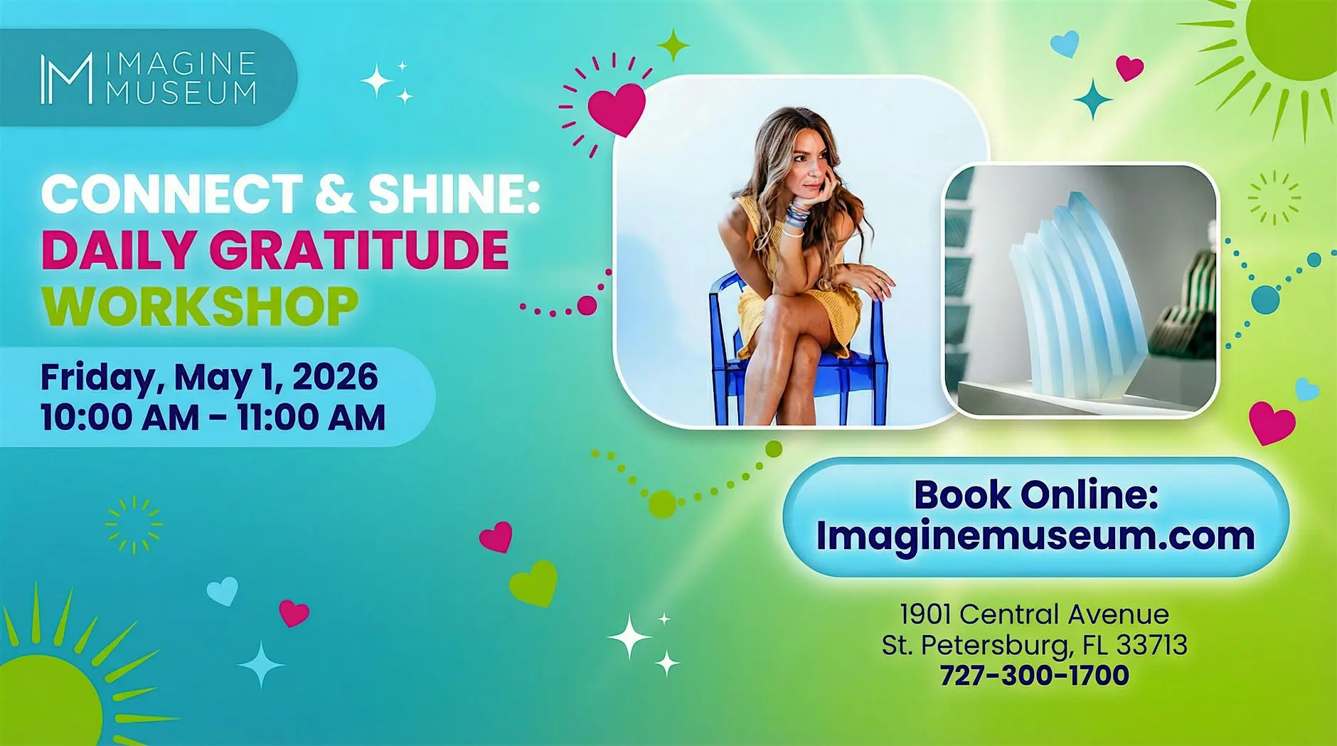 Connect & Shine: Daily Gratitude Workshop in St. Petersburg Community members are invited to begin their day with positivity and reflection at the Connect & Shine: Daily Gratitude Workshop, hosted at the Imagine Museum in St. Petersburg, Florida. This uplifting workshop will take place on Friday, May 1, from 10:00 AM to 11:00 AM, and is designed to help participants cultivate mindfulness, gratitude, and personal connection through guided reflection and shared experiences in an inspiring museum setting. The event is organized by Imagine Museum, known for its dedication to contemporary glass art and meaningful community programming that encourages creativity and well-being. 📍 Location: Imagine Museum, St. Petersburg, FL 🗓️ Date & Time: Friday, May 1 | 10:00 AM – 11:00 AM 🎟️ Registration: https://www.eventbrite.com/e/connect-shine-daily-gratitude-workshop-tickets-1985444357520?aff=ebdssbdestsearch 📸 Social Media: https://www.instagram.com/p/DWj03O-AeSo/ This is a reshare post by Tampa Bay Connects. We do not host this event. #Tampa #TampaBay #StPete #Clearwater #ThingsToDo #LocalEvents #Networking #TampaBayConnects #TampaNetworking #WomenInBusiness #TampaEntrepreneurs #Startups #TampaEats #TampaNightlife #DowntownTampa #TampaEvents #TampaSocials #tampaMagazine #TampaBayMagazine TampaBusinessClub.com Tampabayconnects.com WomenImpactNetwork.com TampaBayLatinChamber.com InGateConsulting.com 🔗 Register here: https://www.eventbrite.com/e/connect-shine-daily-gratitude-workshop-tickets-1985444357520?aff=ebdssbdestsearch Tampa Bay Connects is a community discovery and media platform. We do not organize, host, manage, or operate the events featured on this site. All events, trademarks, logos, photographs, and promotional materials are the property of their respective owners and are displayed for informational and promotional purposes only. Our content is shared to help connect the community with local experiences and is sourced from public event listings, organizers, or official promotional channels. Full credit is given to the original event organizers, and direct links to official event pages are provided whenever available. Inclusion on TampaBayConnects.com does not imply sponsorship, partnership, or endorsement by Tampa Bay Connects, unless explicitly stated. tampabayconnects