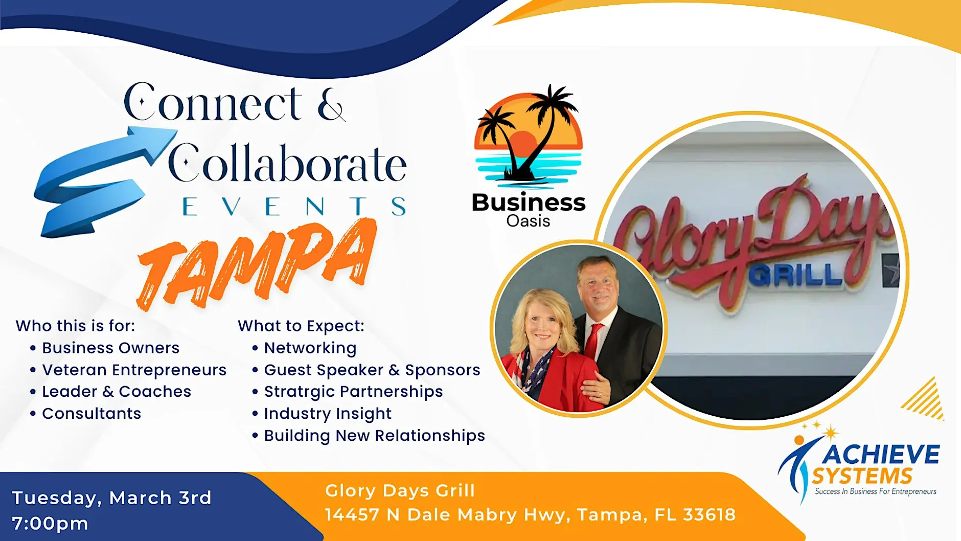 Tampa Bay Connects | Reshare Event Feature Tampa Bay Connects is resharing a recurring networking opportunity for professionals looking to connect, collaborate, and grow within the Tampa Bay business community. The Connect & Collaborate Tampa – Monthly Networking event will be held at Glory Days Grill, Tampa, FL, with multiple dates available. This ongoing meetup is designed to bring together entrepreneurs, professionals, and community members for meaningful conversations, relationship-building, and collaboration opportunities. This networking series is organized through Business Oasis, with community engagement and participation from local professionals including Marty Dickinson and Charles Budreau, who actively support business networking and professional development initiatives in the region. Event & Registration Links: Eventbrite Registration: https://www.eventbrite.com/e/connect-collaborate-tampa-monthly-networking-tickets-1983080823125?aff=ebdssbdestsearch Event Information: https://businessoasis.org/events/ Community Social Media: LinkedIn Post: https://www.linkedin.com/posts/martydickinson_florida-activity-7272317377575280640-XI0N/ Charles Budreau LinkedIn: https://www.linkedin.com/in/charles-budreau-cissp/ Tampa Bay Connects is a reshare platform and does not host this event. All details, registration, and updates should be directed to the organizers and official event pages. A great opportunity for professionals in Tampa Bay to expand their network and build valuable connections through consistent monthly engagement. #Tampa #TampaBay #StPete #Clearwater #ThingsToDo #LocalEvents #Networking #TampaBayConnects #TampaNetworking #WomenInBusiness #TampaEntrepreneurs #Startups #TampaEats #TampaNightlife #DowntownTampa #TampaEvents #TampaSocials #tampaMagazine #TampaBayMagazine TampaBusinessClub.com Tampabayconnects.com WomenImpactNetwork.com TampaBayLatinChamber.com InGateConsulting.com 🔗 Register here: https://www.eventbrite.com/e/connect-collaborate-tampa-monthly-networking-tickets-1983080823125?aff=ebdssbdestsearch Tampa Bay Connects is a community discovery and media platform. We do not organize, host, manage, or operate the events featured on this site. All events, trademarks, logos, photographs, and promotional materials are the property of their respective owners and are displayed for informational and promotional purposes only. Our content is shared to help connect the community with local experiences and is sourced from public event listings, organizers, or official promotional channels. Full credit is given to the original event organizers, and direct links to official event pages are provided whenever available. Inclusion on TampaBayConnects.com does not imply sponsorship, partnership, or endorsement by Tampa Bay Connects, unless explicitly stated. tampabayconnects