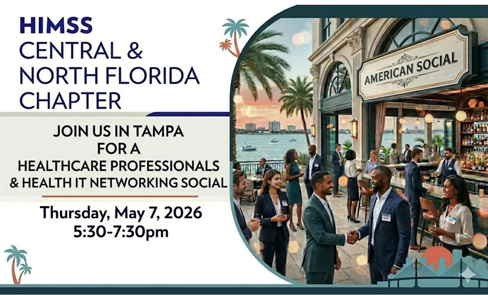 Tampa Bay Connects | Reshare Event Feature Tampa Bay Connects is resharing an upcoming professional networking opportunity for those in healthcare, health IT, and related industries. The CNFL HIMSS Tampa Healthcare Professionals & Health IT Networking Social will take place on Thursday, May 7, from 5:30 PM to 7:30 PM at American Social – Bar & Kitchen, Tampa, FL. This event brings together healthcare professionals, IT specialists, and industry leaders for an evening of networking, collaboration, and community building. This networking social is organized by Central North Florida HIMSS (CNFL HIMSS), a professional chapter of the Healthcare Information and Management Systems Society dedicated to advancing healthcare information technology through connection and education. Event & Registration Links: Eventbrite Registration: https://www.eventbrite.com/e/cnfl-himss-tampa-healthcare-professionals-health-it-networking-social-tickets-1985734786200?aff=ebdssbdestsearch Official Event Page: https://centralnorthflorida.himss.org/events/tampa-networking-event-0 CNFL HIMSS Website: https://centralnorthflorida.himss.org/ Social Media: X (Twitter): https://x.com/CNFLHIMSS Tampa Bay Connects is a reshare platform and does not host this event. All registration and event inquiries should be directed to the official organizers. A strong opportunity for healthcare and tech professionals in Tampa to connect, share insights, and expand their professional network within the industry. #Tampa #TampaBay #StPete #Clearwater #ThingsToDo #LocalEvents #Networking #TampaBayConnects #TampaNetworking #WomenInBusiness #TampaEntrepreneurs #Startups #TampaEats #TampaNightlife #DowntownTampa #TampaEvents #TampaSocials #tampaMagazine #TampaBayMagazine TampaBusinessClub.com Tampabayconnects.com WomenImpactNetwork.com TampaBayLatinChamber.com InGateConsulting.com 🔗 Register here: https://www.eventbrite.com/e/cnfl-himss-tampa-healthcare-professionals-health-it-networking-social-tickets-1985734786200?aff=ebdssbdestsearch Tampa Bay Connects is a community discovery and media platform. We do not organize, host, manage, or operate the events featured on this site. All events, trademarks, logos, photographs, and promotional materials are the property of their respective owners and are displayed for informational and promotional purposes only. Our content is shared to help connect the community with local experiences and is sourced from public event listings, organizers, or official promotional channels. Full credit is given to the original event organizers, and direct links to official event pages are provided whenever available. Inclusion on TampaBayConnects.com does not imply sponsorship, partnership, or endorsement by Tampa Bay Connects, unless explicitly stated. tampabayconnects