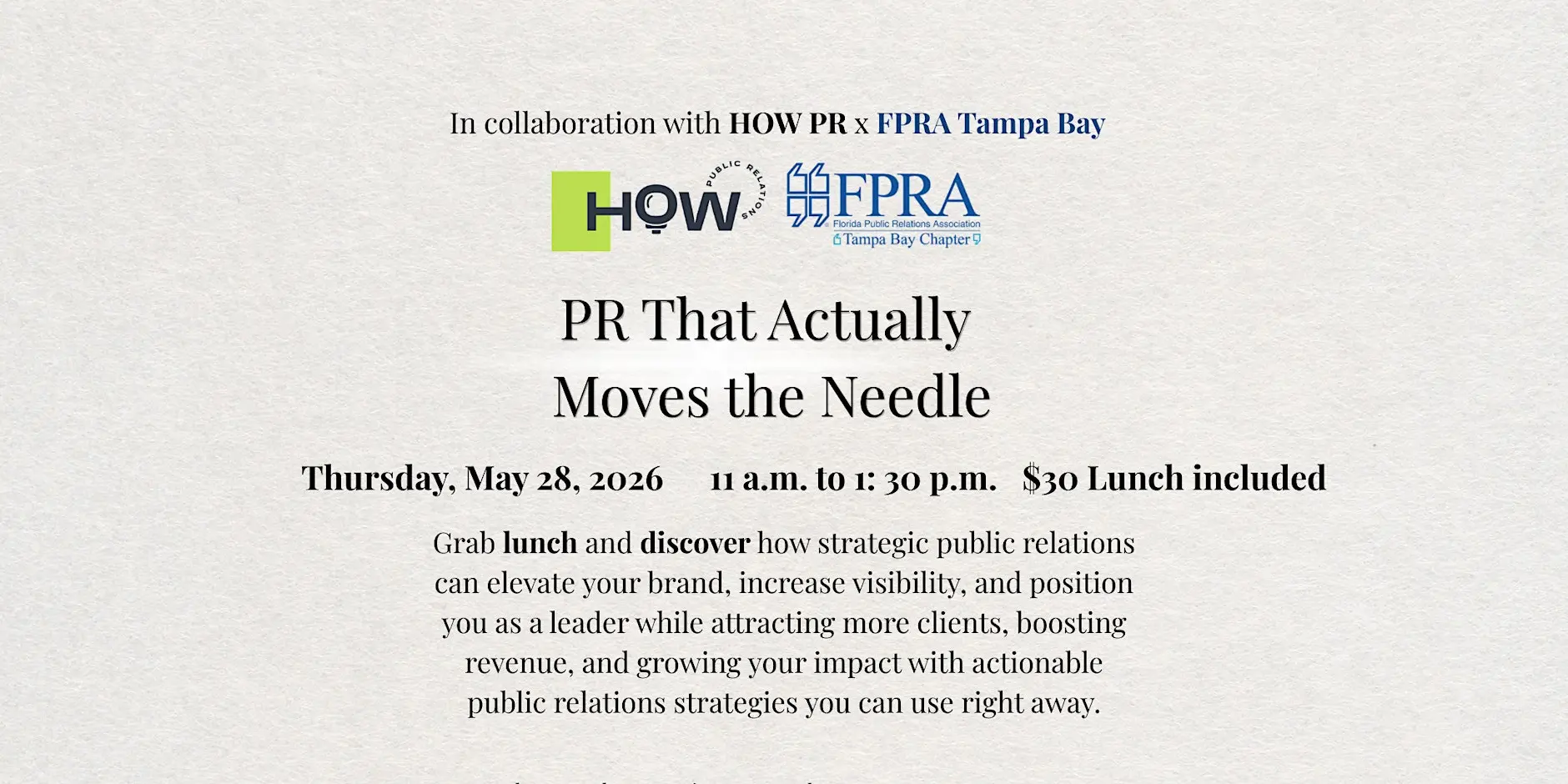 📣 Press, Presence & Profit: A Public Relations Workshop – Tampa, FL Tampa Bay professionals, entrepreneurs, and creatives are invited to join “Press, Presence & Profit: A Public Relations Workshop,” an interactive session designed to help attendees strengthen their brand visibility, media presence, and PR strategy for business growth. This workshop is organized by the Florida Public Relations Association – Tampa Bay Chapter (FPRA Tampa Bay), a professional organization dedicated to advancing the practice of public relations and supporting communications professionals across the region. 📅 Event Details Event Name: Press, Presence & Profit: A Public Relations Workshop Organizer: FPRA Tampa Bay (Florida Public Relations Association – Tampa Bay Chapter) Location: The Poké Company, Tampa, Florida Date: Thursday, May 28 Time: 11:00 AM – 1:00 PM 🎟️ Registration Link 👉https://www.eventbrite.com/e/press-presence-profit-a-public-relations-workshop-registration-1986925052318?aff=ebdssbdestsearch 🌐 Organizer Links Website: http://www.fpratampabay.org/ Facebook: https://www.facebook.com/FPRATampa/ 📝 About This Post Tampa Bay Connects is a reshare platform sharing community events for informational purposes only. We do not host, organize, or manage these events. For registration, updates, and full event details, please contact the official organizers directly. #Tampa #TampaBay #StPete #Clearwater #ThingsToDo #LocalEvents #Networking #TampaBayConnects #TampaNetworking #WomenInBusiness #TampaEntrepreneurs #Startups #TampaEats #TampaNightlife #DowntownTampa #TampaEvents #TampaSocials #tampaMagazine #TampaBayMagazine TampaBusinessClub.com Tampabayconnects.com WomenImpactNetwork.com TampaBayLatinChamber.com InGateConsulting.com 🔗 Register here: https://www.eventbrite.com/e/press-presence-profit-a-public-relations-workshop-registration-1986925052318?aff=ebdssbdestsearch Tampa Bay Connects is a community discovery and media platform. We do not organize, host, manage, or operate the events featured on this site. All events, trademarks, logos, photographs, and promotional materials are the property of their respective owners and are displayed for informational and promotional purposes only. Our content is shared to help connect the community with local experiences and is sourced from public event listings, organizers, or official promotional channels. Full credit is given to the original event organizers, and direct links to official event pages are provided whenever available. Inclusion on TampaBayConnects.com does not imply sponsorship, partnership, or endorsement by Tampa Bay Connects, unless explicitly stated. tampabayconnects
