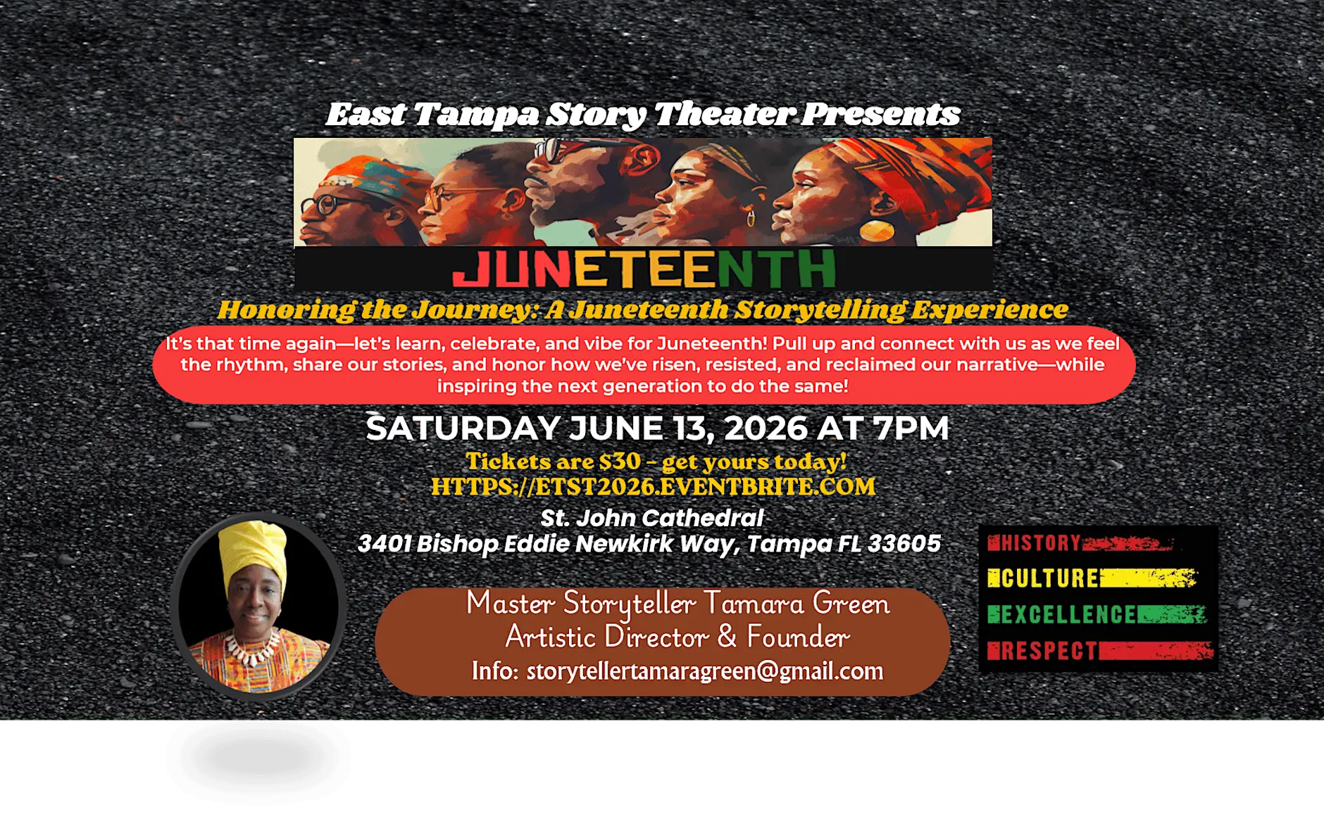 ✊🏾 Honoring the Journey: A Juneteenth Storytelling Experience in Tampa This June, Tampa invites the community to reflect, connect, and celebrate history through the power of storytelling at “Honoring the Journey: A Juneteenth Storytelling Experience.” This meaningful event will feature powerful narratives that honor resilience, heritage, and the journey toward freedom—creating a space for reflection, education, and cultural appreciation. Through storytelling, attendees will experience voices and perspectives that bring the spirit of Juneteenth to life. 📍 Location: 3401 Bishop Eddie Newkirk Way, Tampa, FL 📅 Date: Saturday, June 13 ⏰ Time: 7:00 PM – 9:00 PM This event offers an intimate and impactful evening for those looking to engage with history in a deeper and more personal way. 🎟️ Register here: https://www.eventbrite.com/e/honoring-the-journey-a-juneteenth-storytelling-experience-tickets-1986175540508?aff=ebdssbdestsearch 📲 Instagram: https://www.instagram.com/storytellertamaragreen/ #Tampa #TampaBay #StPete #Clearwater #ThingsToDo #LocalEvents #Networking #TampaBayConnects #TampaNetworking #WomenInBusiness #TampaEntrepreneurs #Startups #TampaEats #TampaNightlife #DowntownTampa #TampaEvents #TampaSocials #tampaMagazine #TampaBayMagazine TampaBusinessClub.com Tampabayconnects.com WomenImpactNetwork.com TampaBayLatinChamber.com InGateConsulting.com 🔗 Register here: https://www.eventbrite.com/e/honoring-the-journey-a-juneteenth-storytelling-experience-tickets-1986175540508?aff=ebdssbdestsearch Tampa Bay Connects is a community discovery and media platform. We do not organize, host, manage, or operate the events featured on this site. All events, trademarks, logos, photographs, and promotional materials are the property of their respective owners and are displayed for informational and promotional purposes only. Our content is shared to help connect the community with local experiences and is sourced from public event listings, organizers, or official promotional channels. Full credit is given to the original event organizers, and direct links to official event pages are provided whenever available. Inclusion on TampaBayConnects.com does not imply sponsorship, partnership, or endorsement by Tampa Bay Connects, unless explicitly stated. tampabayconnects