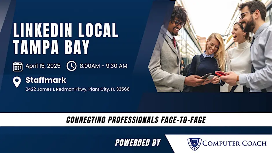 💼 LinkedIn Local Tampa Bay | Plant City Networking Event Grow your professional network and make meaningful connections at LinkedIn Local Tampa Bay. This engaging event brings together professionals, entrepreneurs, and community members for authentic, in-person networking beyond the screen. Hosted at Staffmark in Plant City, FL, the event will take place on Wednesday, April 15 from 8:00 AM to 9:30 AM, making it a perfect way to start your day with productive conversations and new opportunities. 🗓 Date & Time: Wednesday, April 15 | 8:00 AM – 9:30 AM 📍 Location: Staffmark, Plant City, FL 🎟 Register here: https://www.eventbrite.com/e/linkedin-local-tampa-bay-tickets-1985365421420?aff=ebdssbdestsearch 📱 Social Media & Event Post: LinkedIn: https://www.linkedin.com/posts/suzannericci_linkedinlocal-networking-tampabay-activity-7286805530449215488-JjOV/ Instagram: https://www.instagram.com/computercoach1/ This event is a great opportunity to connect face-to-face with professionals in the Tampa Bay area and build relationships that go beyond online networking. #Tampa #TampaBay #StPete #Clearwater #ThingsToDo #LocalEvents #Networking #TampaBayConnects #TampaNetworking #WomenInBusiness #TampaEntrepreneurs #Startups #TampaEats #TampaNightlife #DowntownTampa #TampaEvents #TampaSocials #tampaMagazine #TampaBayMagazine TampaBusinessClub.com Tampabayconnects.com WomenImpactNetwork.com TampaBayLatinChamber.com InGateConsulting.com 🔗 Register here: https://www.eventbrite.com/e/linkedin-local-tampa-bay-tickets-1985365421420?aff=ebdssbdestsearch Tampa Bay Connects is a community discovery and media platform. We do not organize, host, manage, or operate the events featured on this site. All events, trademarks, logos, photographs, and promotional materials are the property of their respective owners and are displayed for informational and promotional purposes only. Our content is shared to help connect the community with local experiences and is sourced from public event listings, organizers, or official promotional channels. Full credit is given to the original event organizers, and direct links to official event pages are provided whenever available. Inclusion on TampaBayConnects.com does not imply sponsorship, partnership, or endorsement by Tampa Bay Connects, unless explicitly stated. tampabayconnects