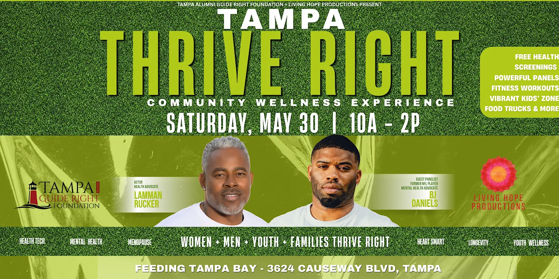 Tampa Thrive Right Community Wellness Experience Tampa Bay Connects is pleased to reshare an upcoming community-focused event dedicated to health, empowerment, and connection. The Tampa Thrive Right Community Wellness Experience is set to bring together local leaders, organizations, and residents for a day centered on well-being and community support. This event will take place on Saturday, May 30, from 10:00 AM to 2:00 PM at Feeding Tampa Bay in Tampa, FL. Attendees can expect a variety of wellness-focused activities, resources, and opportunities to engage with initiatives that promote healthier lifestyles and stronger communities. The event is supported by community-driven organizations including Tampa Guide Right and Tampa Bay GR Foundation, along with local advocates and leaders such as Lamman Rucker and B. J. Daniels, who are known for their involvement in youth development and community outreach. Whether you’re looking to improve your wellness, connect with local organizations, or simply be part of a positive community experience, this event offers something for everyone. 🔗 Register here: https://www.eventbrite.com/e/tampa-thrive-right-community-wellness-experience-tickets-1986662463909?aff=ebdssbdestsearch 🌐 Learn more: https://tampagrfoundation.org/ 📱 Follow on Instagram: https://www.instagram.com/lammanruckerofficial/ https://www.instagram.com/tampaguideright/ https://www.instagram.com/bj.daniels5/ #Tampa #TampaBay #StPete #Clearwater #ThingsToDo #LocalEvents #Networking #TampaBayConnects #TampaNetworking #WomenInBusiness #TampaEntrepreneurs #Startups #TampaEats #TampaNightlife #DowntownTampa #TampaEvents #TampaSocials #tampaMagazine #TampaBayMagazine TampaBusinessClub.com Tampabayconnects.com WomenImpactNetwork.com TampaBayLatinChamber.com InGateConsulting.com 🔗 Register here: https://www.eventbrite.com/e/tampa-thrive-right-community-wellness-experience-tickets-1986662463909?aff=ebdssbdestsearch Tampa Bay Connects is a community discovery and media platform. We do not organize, host, manage, or operate the events featured on this site. All events, trademarks, logos, photographs, and promotional materials are the property of their respective owners and are displayed for informational and promotional purposes only. Our content is shared to help connect the community with local experiences and is sourced from public event listings, organizers, or official promotional channels. Full credit is given to the original event organizers, and direct links to official event pages are provided whenever available. Inclusion on TampaBayConnects.com does not imply sponsorship, partnership, or endorsement by Tampa Bay Connects, unless explicitly stated. tampabayconnects