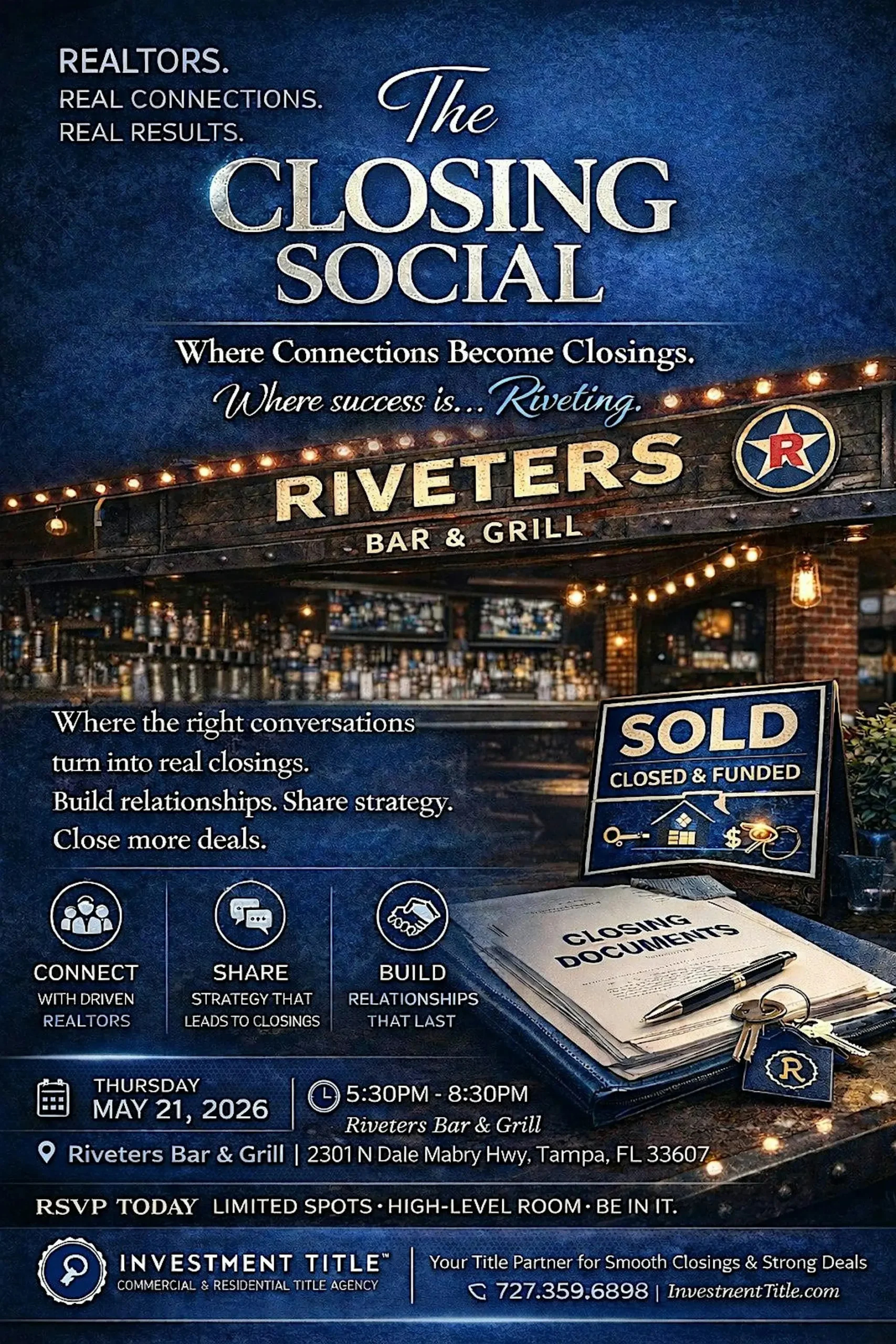 The Closing Social Brings Tampa Professionals Together for an Evening of Connection TAMPA, FL — Professionals across the Tampa Bay area are invited to unwind, connect, and celebrate at The Closing Social, a dynamic networking event designed to bring the business community together in a relaxed and engaging setting. Organized by the Tampa Business Club, this event will take place on Thursday, May 21, from 5:30 PM to 8:30 PM at Riveters Tampa in Tampa, FL. Attendees can look forward to an evening of meaningful conversations, new connections, and opportunities to strengthen professional relationships. Whether you’re a business owner, entrepreneur, or professional looking to expand your network, The Closing Social offers the perfect environment to engage with like-minded individuals and close out the day on a high note. To register and learn more, visit: 👉 https://www.eventbrite.com/e/the-closing-social-tickets-1986660540155?aff=ebdssbdestsearch Join the community and stay updated through Facebook: 📘 Group: https://www.facebook.com/groups/1542837962694832/posts/4229950307316904/ 👤 Organizer Profile: https://www.facebook.com/groups/1542837962694832/user/100054956425548/ #Tampa #TampaBay #StPete #Clearwater #ThingsToDo #LocalEvents #Networking #TampaBayConnects #TampaNetworking #WomenInBusiness #TampaEntrepreneurs #Startups #TampaEats #TampaNightlife #DowntownTampa #TampaEvents #TampaSocials #tampaMagazine #TampaBayMagazine TampaBusinessClub.com Tampabayconnects.com WomenImpactNetwork.com TampaBayLatinChamber.com InGateConsulting.com 🔗 Register here: https://www.eventbrite.com/e/the-closing-social-tickets-1986660540155?aff=ebdssbdestsearch Tampa Bay Connects is a community discovery and media platform. We do not organize, host, manage, or operate the events featured on this site. All events, trademarks, logos, photographs, and promotional materials are the property of their respective owners and are displayed for informational and promotional purposes only. Our content is shared to help connect the community with local experiences and is sourced from public event listings, organizers, or official promotional channels. Full credit is given to the original event organizers, and direct links to official event pages are provided whenever available. Inclusion on TampaBayConnects.com does not imply sponsorship, partnership, or endorsement by Tampa Bay Connects, unless explicitly stated. tampabayconnects