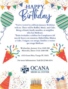 Celebrate with your fellow seniors at the Birthday Celebration for Seniors on January 14 from 10β―AM to 12β―PM EST at Ocana Medical Center, located at 6553 Gunn Highway, Tampa, FL 33625. This festive morning brings together seniors for a special celebration filled with laughter, treats, and community connection.