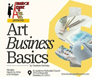 The meeting will take place on Monday, March 16, from 6:30 PM to 8:30 PM at St. Andrew’s United Methodist Church, Brandon, FL. Attendees can expect an inspiring and welcoming environment focused on artistic growth, community engagement, and networking among local artists.