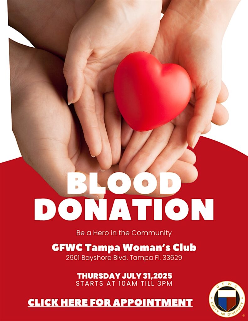 Make a difference that truly matters—join us on Thursday, July 31, from 10 AM to 3 PM EDT for the GFWC Tampa Woman’s Club Blood Drive! 📍 Location: GFWC Tampa ...