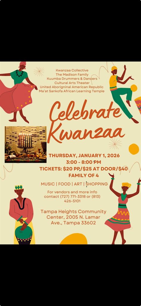 Welcome the new year with culture, unity, and community at Celebrate Kwanzaa, happening January 1 from 3 PMβ8 PM EST in Tampa. This uplifting event brings people together to honor ...