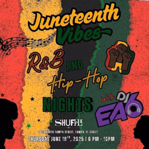 Get ready for an evening of music, connection, culture, and joy as Tampa comes together for an unforgettable Juneteenth Celebration @ Shuffle!