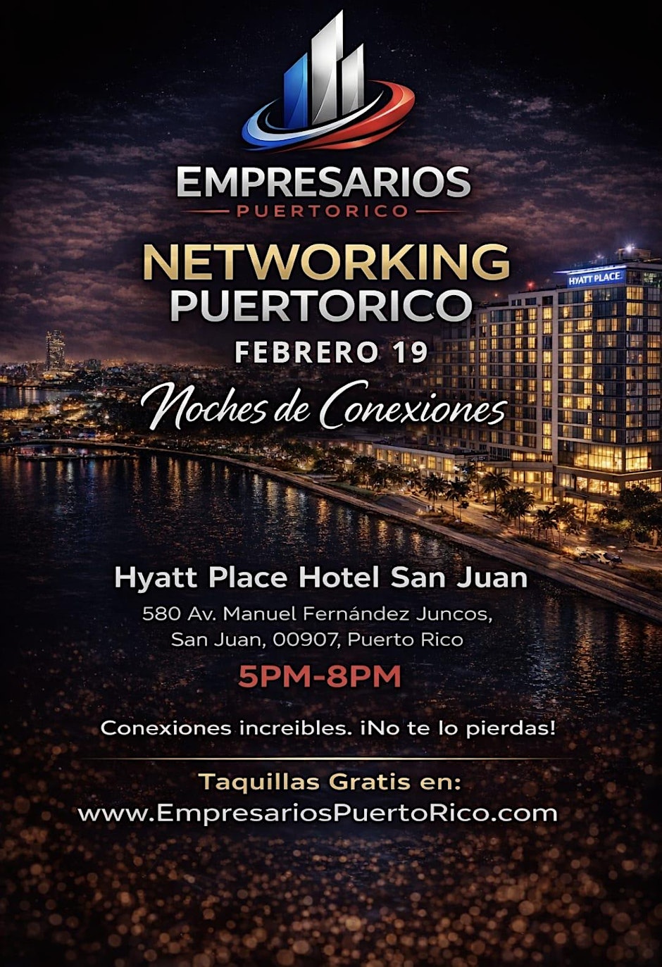 The event will take place on February 19, from 5:00 PM to 8:00 PM AST, at Hyatt Place San Juan.
