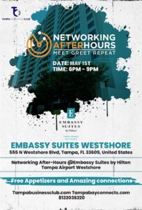 Looking to expand your professional network while enjoying delicious bites? Don’t miss the Networking After-Hours at Embassy Suites Westshore on Thursday, May 1, from 6 PM to 9 PM EDT. This event is the perfect opportunity to connect with like-minded professionals, build new relationships, and share exciting ideasโall in a relaxed atmosphere.