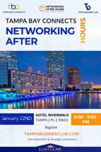 The event will take place on Monday, January 22, from 6:00 PM to 9:00 PM EST at Hotel Tampa Riverwalk, located in downtown Tampa.