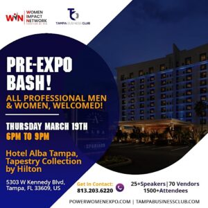 Tampa Bay Connects is resharing the upcoming PRE-EXPO BASH! All Invited – Free Appetizers, a networking celebration organized by the Women Impact Network in collaboration with the Tampa Business community. The event will be held on March 19 from 6:00 PM to 9:00 PM EDT at Hotel Alba Tampa, Tapestry Collection by Hilton in Tampa, Florida.