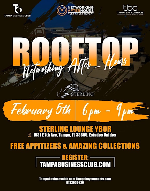 Organized by Tampa Business Club, the event will take place on Wednesday, February 5, from 6:00 PM to 9:00 PM EST at Sterling Cigar Lounge & Bar in Ybor City. Attendees can enjoy a relaxed rooftop setting while expanding their professional network.