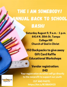 Get ready, Tampa! The I AM Somebody! Annual Back to School Bash is back — and it’s bigger, better, and more community-driven than ever. Set your calendars for Saturday, August 9th from 9 AM to 1 PM at the College Hill Church of God in Christ, located at 6414 North 30th Street, Tampa, FL 33610.