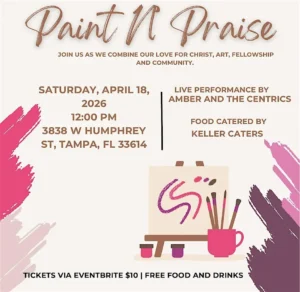 Community members are invited to enjoy an uplifting and creative experience at Paint N’ Praise, taking place on Saturday, April 18, from 12:00 PM to 1:30 PM at 3838 W Humphrey St in Tampa.