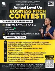An exciting opportunity for entrepreneurs and innovators is coming to Tampa Bay! The Pitch Competition, organized by National Coalition of 100 Black Women Tampa Bay Area Chapter, invites participants to showcase their business ideas and compete for recognition while connecting with the local business community.