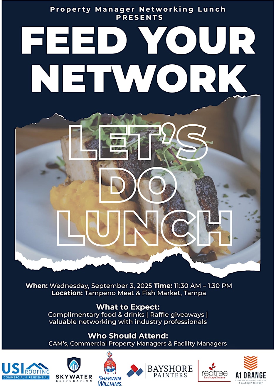 Calling all property managers! Step away from the office and into an afternoon of great food, meaningful connections, and fresh opportunities at the Property Manager Networking Lunch, happening on Wednesday, September 3, from 11:30 AM to 1:30 PM EDT at Tampeño Fish and Meat Market. This exclusive lunch is designed to bring property management professionals together in a relaxed, welcoming atmosphere. Enjoy delicious food while networking with fellow managers, exchanging ideas, and building relationships that can open doors to new opportunities and collaborations. Whether you’re looking to strengthen industry connections or share best practices, this event is the perfect way to expand your professional circle. Seats are limited—secure your spot today and be part of this valuable networking experience! 👉 Register here: Property Manager Networking Lunch Stay connected with our community partner: Bayshore Painters on Instagram ✨ Good food, great people, and powerful connections—don’t miss it! #Tampa #TampaBay #StPete #Clearwater #ThingsToDo #LocalEvents #Networking #TampaBayConnects #TampaNetworking #WomenInBusiness #TampaEntrepreneurs #Startups #TampaEats #TampaNightlife #DowntownTampa #TampaEvents #TampaSocials #tampaMagazine #TampaBayMagazine TampaBusinessClub.com TampaBayConnects.com WomenImpactNetwork.com TampaBayLatinChamber.com https://www.eventbrite.com/e/property-manager-networking-lunch-tickets-1581834683119?aff=ebdssbdestsearch tampabayconnects
