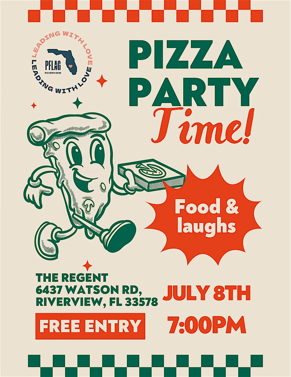 Get ready for a fun, flavorful, and heartwarming evening! PFLAG Riverview invites you to Summer Slice Night on Tuesday, July 8th from 7:00β8:00 PM at The Regent (6437 Watson Road, Riverview, FL 33578). This welcoming event is all about building community, sharing stories, and celebrating pride β one slice at a time! Whether youβre LGBTQ+, an ally, a parent, or a supporter, this casual and connection-focused evening offers a safe and joyful space for everyone to come together, meet new friends, and enjoy some delicious pizza. Expect laughs, local resources, light-hearted conversation, and the uplifting vibes that make the PFLAG community so special. π Grab Your Slice! Seating is limited β donβt miss your chance to join the fun. π Register here on Eventbrite https://www.eventbrite.com/e/pflag-riverview-presents-summer-slice-night-tickets-1375123945739?aff=ebdssbdestsearch π² Stay Connected: πΈ Instagram Event Promo Come as you are. Eat. Laugh. Connect. Because every slice of community matters. #Tampa #TampaBay #StPete #Clearwater #ThingsToDo #LocalEvents #Networking #TampaBayConnects #TampaNetworking #WomenInBusiness #TampaEntrepreneurs #Startups #TampaEats #TampaNightlife #DowntownTampa #TampaEvents #TampaSocials#tampaMagazine #TampaBayMagazine TampaBusinessClub tampabayconnects.com WomenImpactNetwork TampaBayLatinChamber https://www.eventbrite.com/e/pflag-riverview-presents-summer-slice-night-tickets-1375123945739?aff=ebdssbdestsearch tampabayconnects