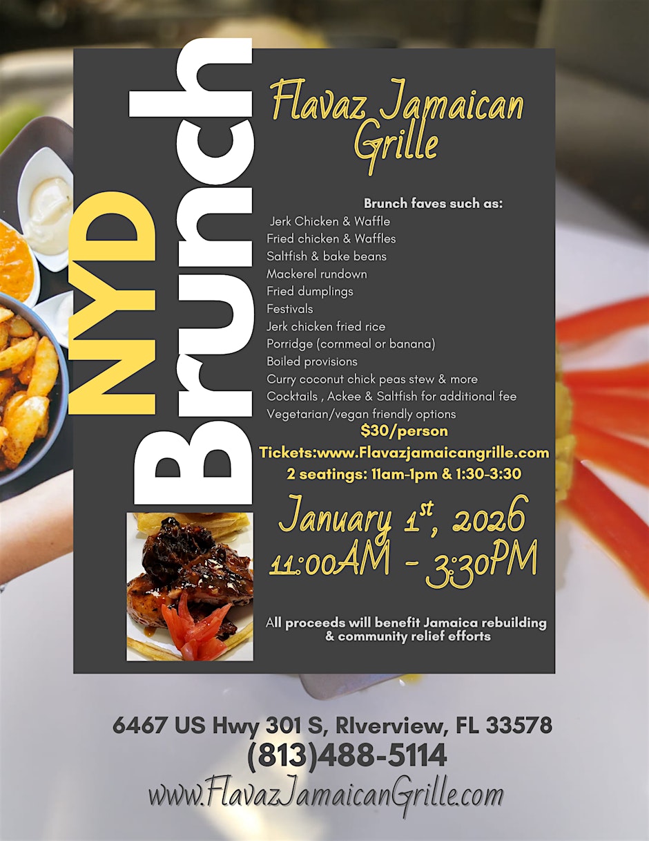 Kick off the New Year in delicious style at the New Year’s Day Brunch Buffet on January 1 from 11 AM to 3:30 PM EST at Flavaz Jamaican Grille in Riverview! Bring your appetite, your friends, and your festive spirit for an afternoon of island-inspired flavors, savory bites, and laid-back vibes that set the perfect tone for an amazing year ahead. 📸 Follow them on Instagram for mouth-watering previews and updates: 👉@Flavaz Jamaican Grille 📍 🥂 Delicious food. Island vibes. A New Year feast to remember! 🥂 👉 Reserve your seat now!! Don’t miss this flavorful way to welcome 2026 — secure your spot today and brunch with a taste of the islands! 🌴🍽️ #Tampa #TampaBay #StPete #Clearwater #ThingsToDo #LocalEvents #Networking #TampaBayConnects #TampaNetworking #WomenInBusiness #TampaEntrepreneurs #Startups #TampaEats #TampaNightlife #DowntownTampa #TampaEvents #TampaSocials #tampaMagazine #TampaBayMagazine TampaBusinessClub.com Tampabayconnects.com WomenImpactNetwork.com TampaBayLatinChamber.com https://www.eventbrite.com/e/new-years-day-brunch-buffet-tickets-1979098453751?aff=ebdssbdestsearch tampabayconnects