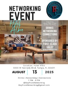 Get ready for a night of stylish networking in one of Tampa’s most stunning venues! Join us for “Networking at Hotel Alba” on Wednesday, August 13, from 7 PM to 9 PM at the chic Hotel Alba Tampa, Tapestry Collection by Hilton, located at 5303 West Kennedy Boulevard.