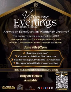 Tampaβs most creative minds are coming together for one unforgettable night! On June 4th, from 7:00 PM to midnight (doors open at 6:30 PM), join fellow trailblazers at Visionary Evenings: A Creative Mixer for Elite Event Professionals, hosted at the stylish Alibaba Lounge & Kava Bar (2317 West Linebaugh Avenue, Tampa, FL 33612).