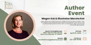 Hosted by Novel in the Neighborhood, the event will take place on Saturday, April 25, from 10:30 AM to 11:30 AM, at 8507 Old County Rd 54, New Port Richey, FL. It’s a wonderful opportunity for young readers to experience stories in a lively and welcoming environment.