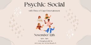 Get ready for an enchanting evening of intuition, connection, and cosmic vibes at the Psychic Social with Three of Cups Entertainment, happening November 12, from 6 PM to 8 PM (EST) at Metaphysically Me, 401 Corey Avenue, St. Pete Beach, FL.