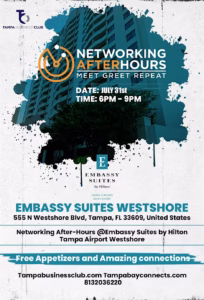 Mark your calendar for Thursday, July 31, 6:00 PM – 9:00 PM — Tampa’s most anticipated networking event is taking over the elegant Embassy Suites by Hilton Tampa Airport Westshore, and you’re invited!